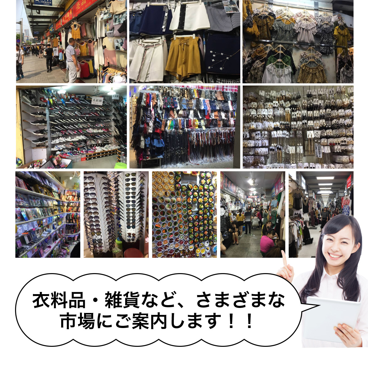 ご安心ください!アートユニオンは自社でも小売りビジネスを行っており中国市場(広州、義烏)での買い付け経験が非常に豊富です。その経験を生かして皆様と市場との良い架け橋になれればと思います。中国市場での買い付けが初めての方から大量購入でコストメリットを出したい企業まで経験豊富な現地スタッフがご案内いたします!